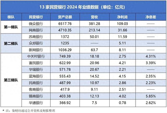 整体来看,在净息差持续收窄、营收增长承压的背景下,2024年民营银行业绩分化明显:网商银行、微众银行资产规模均超过4500亿,营收均超过200亿,持续领跑。